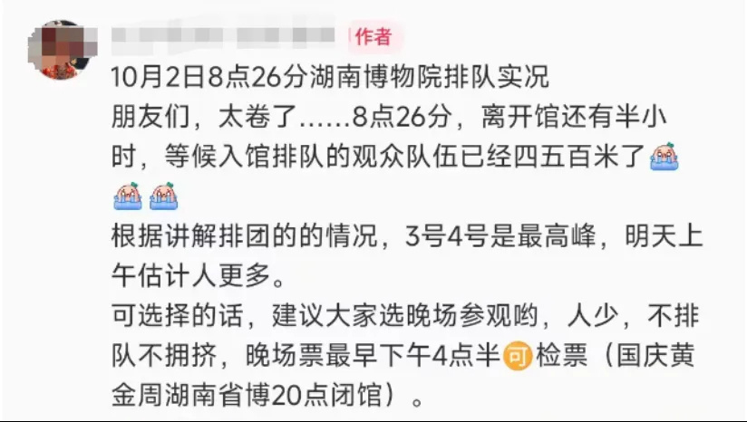 10月2日,一位长沙导游公布了湖南博物院的排队情况。早上8点26分,距离湖南博物院开业还有半个小时,等待排队进入博物馆的观众团队已经达到了400-500米。根据她的判断:“根据解释,3号4号是最高峰,估计明天(3号)早上会有更多的人。”