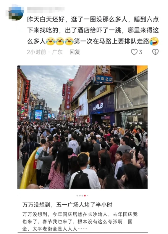 一位广东网友表示,自己被国庆长沙的人流惊呆了,“第一次要在路上排队”。还有人说,今年国庆长沙人太多了,夸张了,“五一广场人堵了半个小时”。