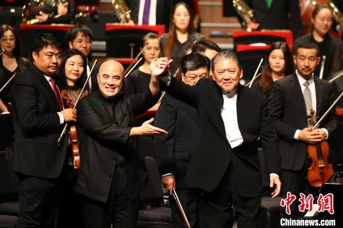 中国钢琴家孔祥东(左)拉着中国指挥家余隆(右)的手向观众问好。中新社记者刘占昆 摄