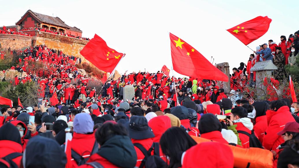 2024年10月2日,泰山之巅的山东泰安,来自全国各地的游客举着五星红旗,一起迎接泰山壮丽的日出。视觉中国 图