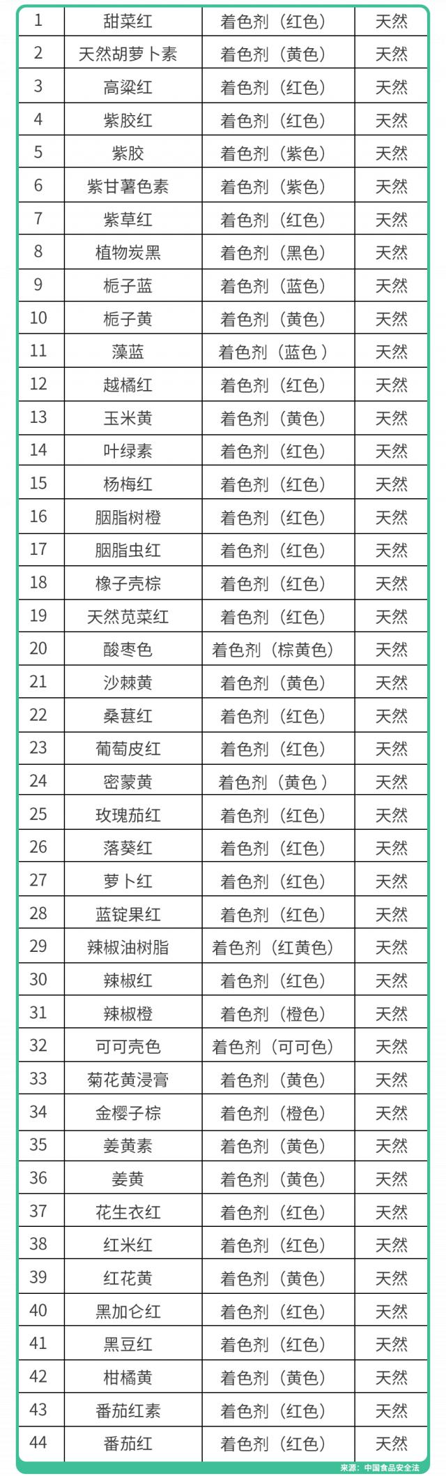 常见的天然色素有甜菜红、天然胡萝卜素、玉米黄、叶绿素、杨梅红等。其他科技大学已经在表格中总结出来了,请保存和收藏。
