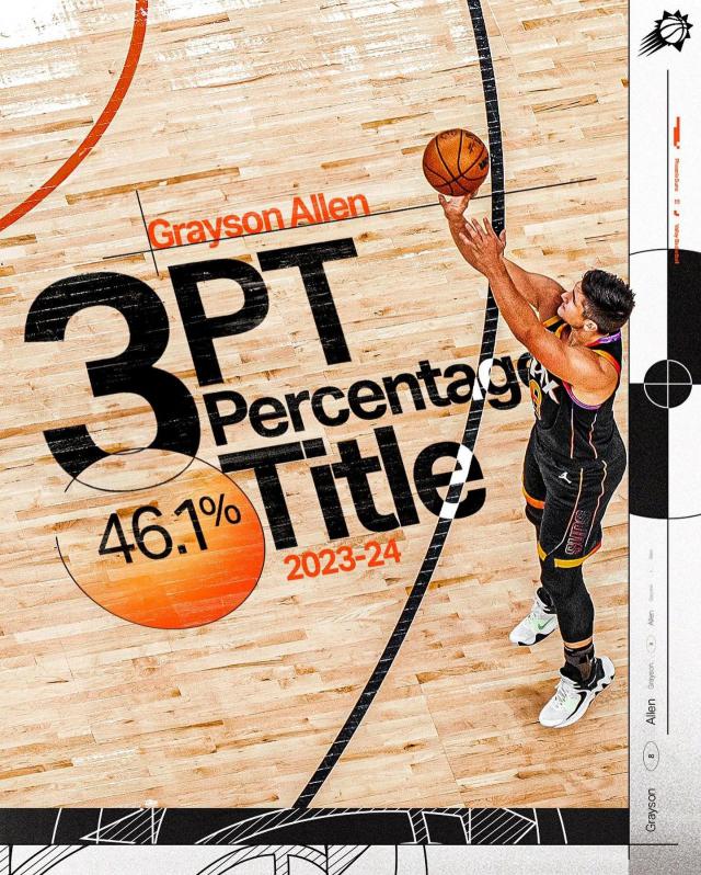 2023-24 格雷森本赛季 - 阿伦为太阳而战 75 常规赛,其中 74 首发。平均每场比赛 33.5 分钟,获得 13.5 分 3.9 篮板 3 助攻,投篮命中率 三分命中率49.9% 46.1%,五个数据都是职业生涯中最高的。另外,阿伦的三分命中率居联盟第一!