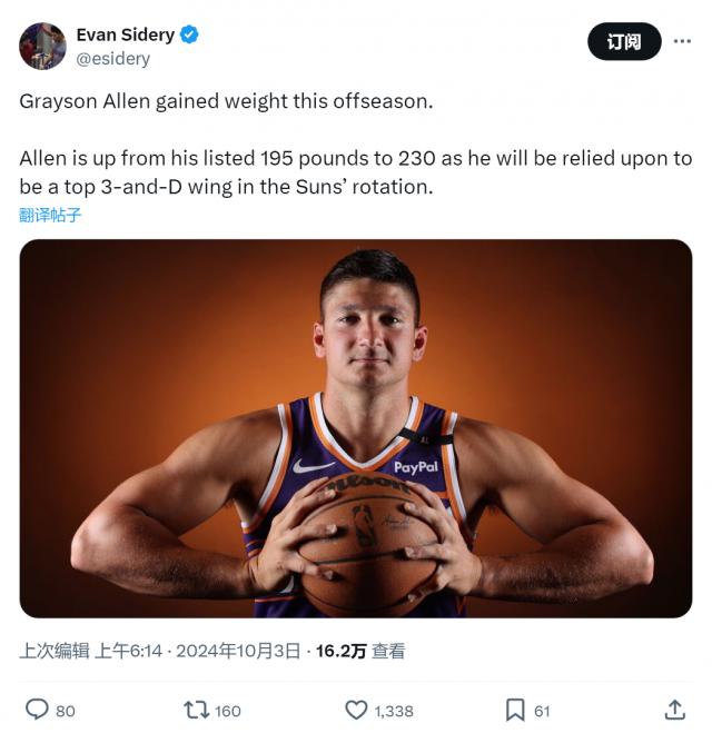 在今年休赛期,有两种球员明显增肌,一种是杰伦。 - 我们已经写过布朗了。另一个是太阳球员格雷森 - 阿伦!阿伦在太阳媒体日上透露,自己在今年休赛期增加体重 35 磅,约等于 31.75 公斤。阿伦现在的体重是 230 磅,大概 208.7 斤。