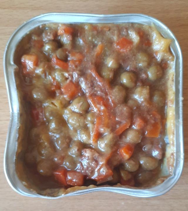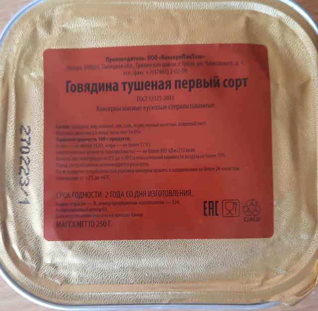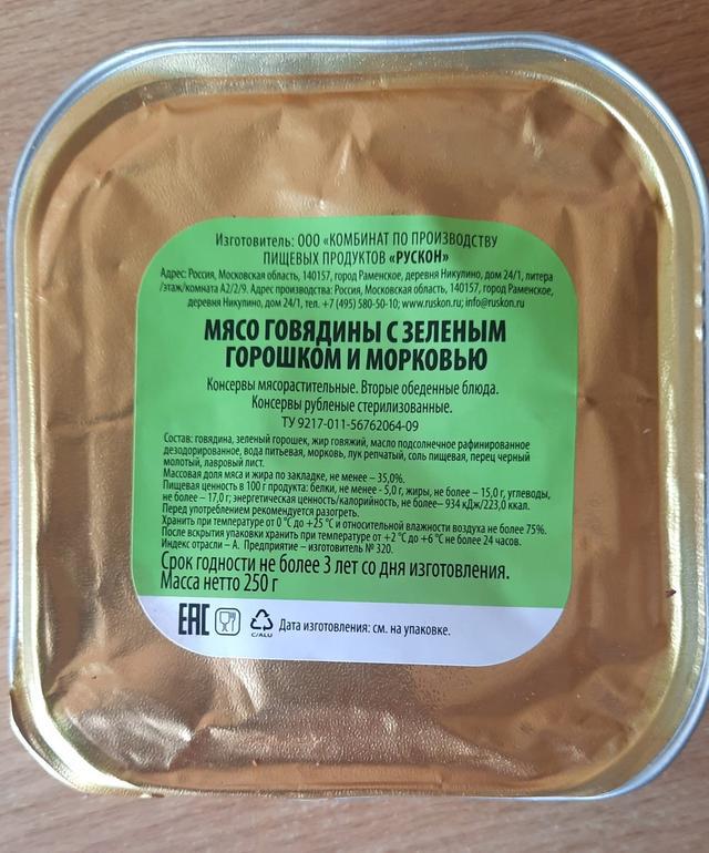 罐头里装了很多牛肉,大豌豆和胡萝卜切成方块。这道菜的重量是 250 克。