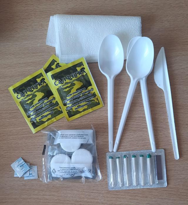 配件包括:三个塑料勺子和一把刀,一个折叠炉,干燃料,火柴,三条湿巾和几张纸巾,以及三个水处理片。除了食物,IRP 它还含有一片“多维矿物复合片”,含有多种维他命矿物质。