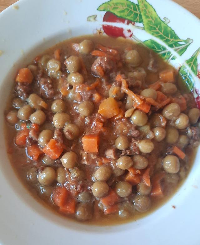 用微波炉加热的第一道菜是牛肉配扁豆和胡萝卜。