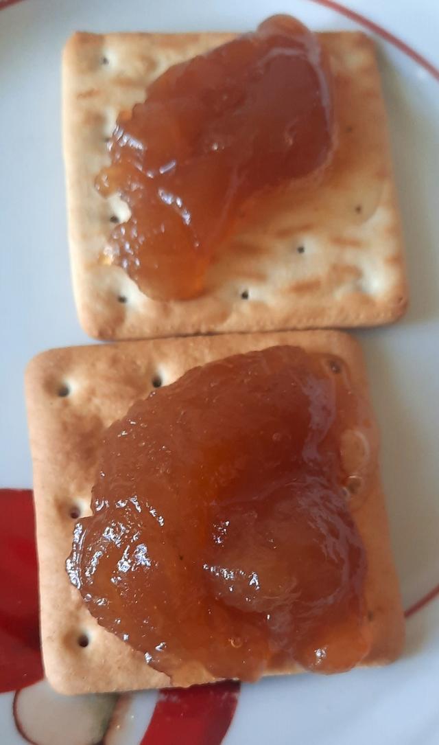 用果酱做了两块饼干。不知是不是好久没吃过这种甜点了,感觉味道很棒。质地均匀,苹果味浓郁,甜度适中。