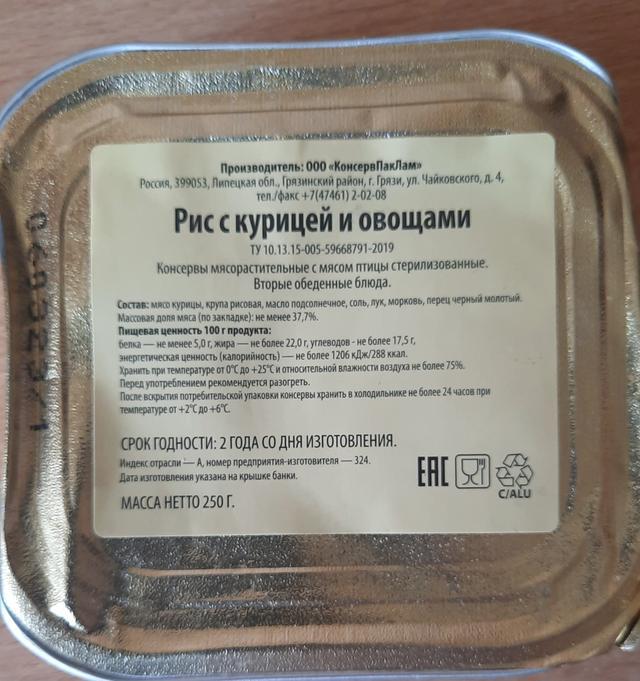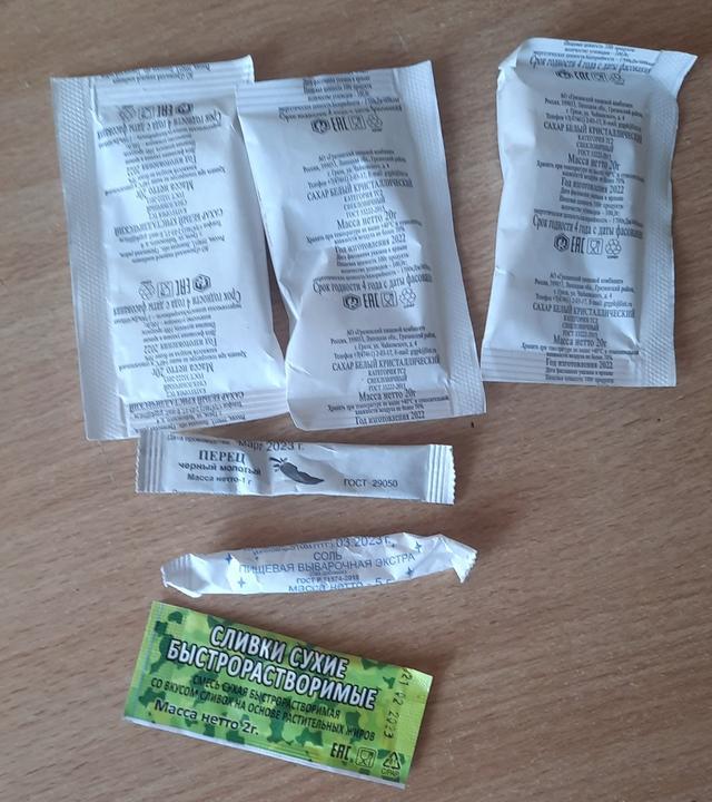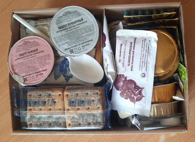 它是一种为一天设计的单人份食品,编号为 1,是 7 其中一种是由“格里亚津食品厂”制造的,重量为 2.1 KG。包装成纸箱,顶部有一根摇杆,内部涂有银色涂层。根据我从其他视频中了解到,这种设计的目的是用它来盛水。