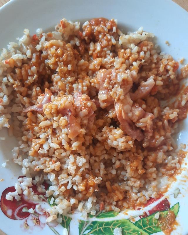 虽然鸡肉在配料表上排名第一,但吃起来几乎被米饭掩盖了。因此,作者决定加入一些培根来增加油脂,并加入一些蔬菜酱来增加汁液和风味。