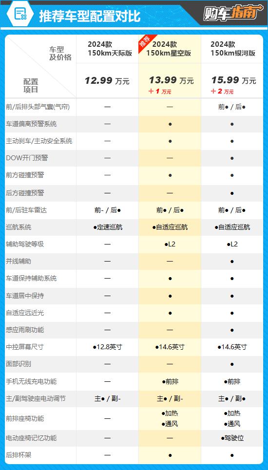 从综合配置和价格来看,编辑认为次顶车型 150km 更值得推荐的星空版。150km 与入门级车型相比,山峰版使用了更大的尺寸。 20 英尺轮毂,并升级为英尺轮毂 360 全景图像和自动空调,但关键的安全配置并未改变。150km 虽然长空版补齐了前侧气囊和后驻车雷达,但在辅助驾驶和舒适配置方面仍存在明显缺失,同样不值得推荐。而 150km 星空版不仅有更完善的主被动安全配置,而且配备了更完善的主被动安全配置。 L2 级别辅助驾驶系统,并将中控屏的尺寸升级为 14.6 英尺,显示效果更好。另外,推荐车型还配备了比较实用的前排手机无线充电功能和前排座椅加热。 / 通风,价格只比较 150km 多出版的长空版本 1 万元,可谓物有所值。