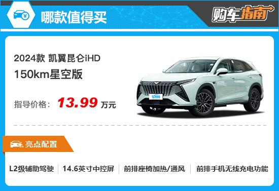 所以,从综合配置和价格来看, 13.99 万元的 150km 凯翼昆仑星空版 iHD 全系列车型性价比较高,建议消费者在购车时优先选择。