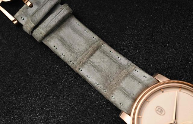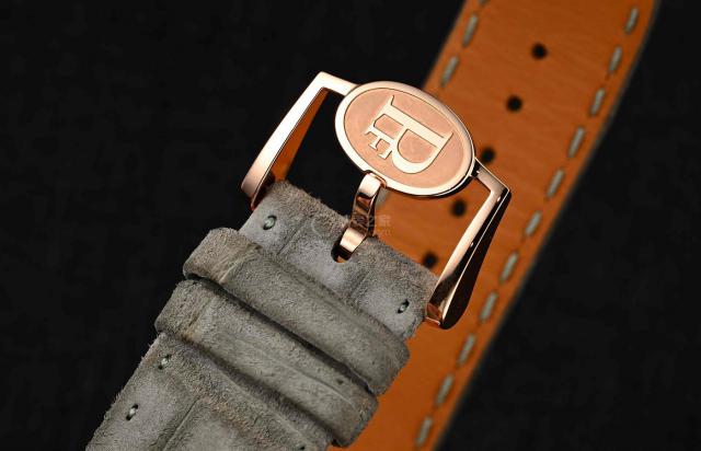 一条灰色鳄鱼皮表带与手表搭配,选择“ punto a mano “只有通过双点缝制技术,才能达到现在磨绒饰面的效果,提高表带的整体奢华感和舒适度;灰色表带优雅温柔,更微妙含蓄,安静又有创意。
