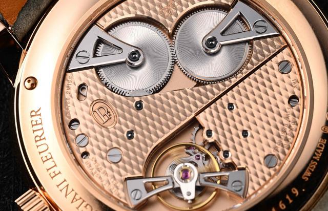PF780是机芯的结构设计。 运动采用原有的结构设计,三个手工倒角抛光的表面形成板桥,营造出几何透视效果,上面装饰着弗勒里耶波纹。(C ô tes de Fleurier),更换组合经过喷砂工艺的夹板,打磨极其细致精致,欣赏度极高。