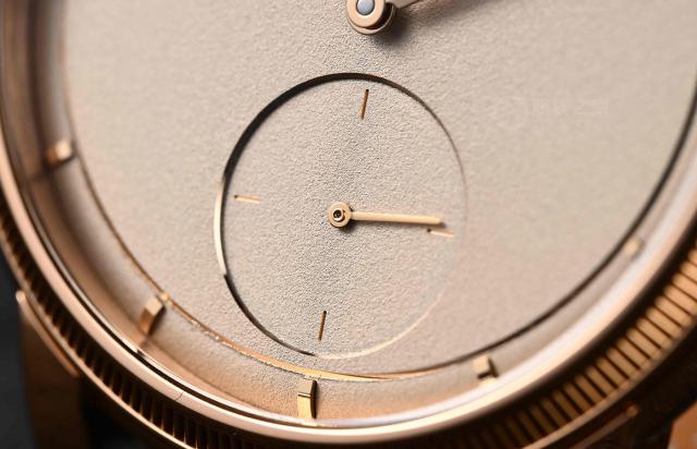 表盘边缘微微下沉到靠近表壳内侧,形成水平高度差。然后,通过精致的“倒角”技术,抛光线条被哑光饰面的表盘包围,与 18K 玫瑰金时标,指针相互映衬,使整个表盘看上去优雅而富有立体感。