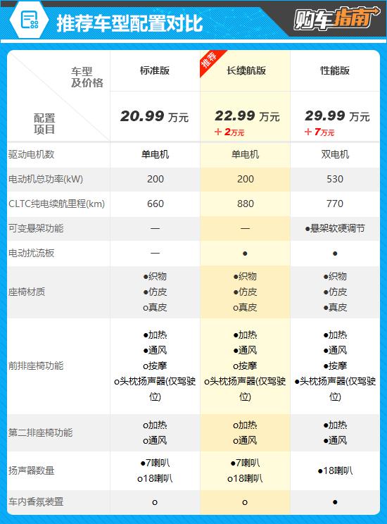 从配置对比来看,推荐车型虽然在配置上只增强了电动尾翼,但与入门级车型相比, CLTC 纯电续航里程大大提高,达到 880km,在一定程度上消除了消费者的里程焦虑,价格上涨 2 一万元,性价比较高。