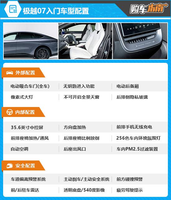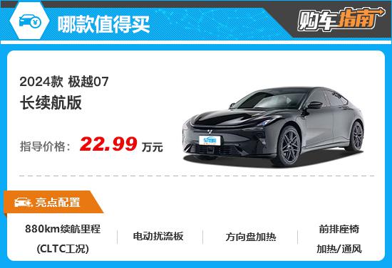 极越 07 共推出 3 汽车,售价区间为 20.99-29.99 万元。同时,针对 2024 年 9 月 30 日 24 点前买车,然后再买 2025 年 1 月 31 前提车客户可享受限时优惠价格、设备升级仪式、无忧用车仪式等权益,其中限时优惠价格为 19.99 万元、21.99 万元和 28.99 万元(详情请咨询当地经销商)。