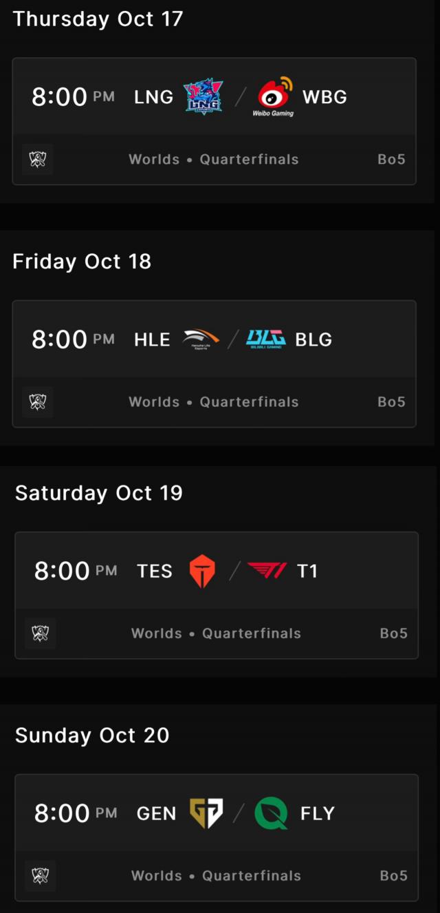 四场比赛将按上述顺序进行。 10 月 17~20 日(IT 世家注:即本周四至周日),赛制为 BO5,比赛时间是每天北京时间。 20:00。