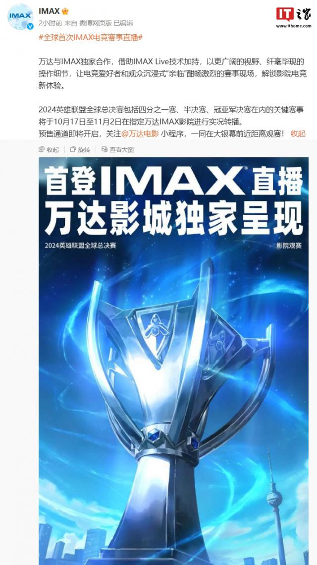 IT 世家 10 月 15 日消息,IMAX 今天,公司官方发布了一份文件:万达与 IMAX 独家合作,2024 传奇联盟世界总决赛包括四分之一赛、半决赛、冠军和亚军决赛。 10 月 17 日至 11 月 2 每天都在规定万达 IMAX 电影院进行直播。