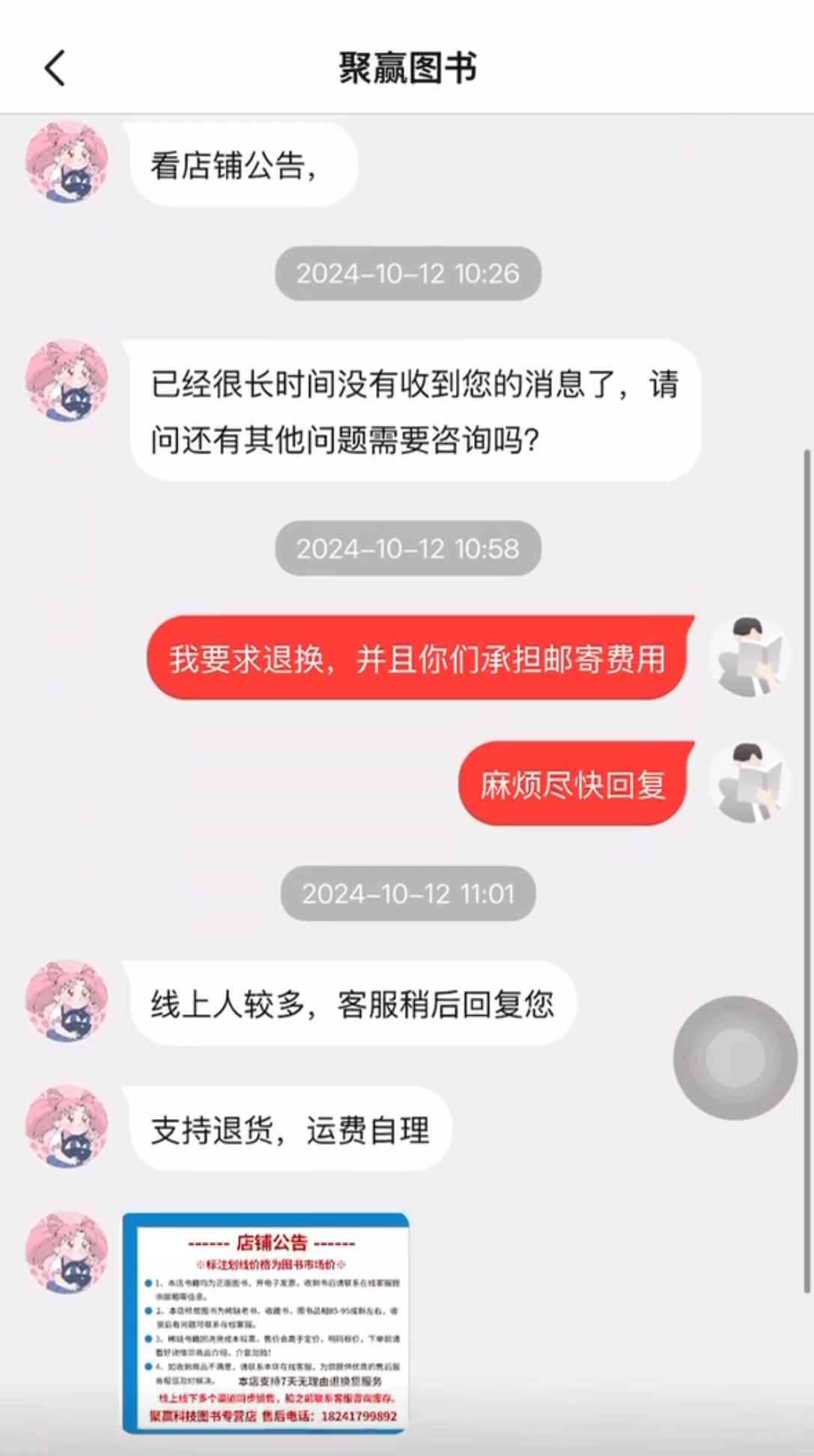 段先生觉得商品本身有问题,让客户承担运费是极其不合理的,于是和商家沟通,希望商家承担相关费用,但被拒绝了。段先生提供的聊天记录显示,两家店的客服都回复了一张内容一致的店铺公告图片。第二项显示:我店经营书籍为稀缺老书和收藏书,书籍颜色为85-95新。