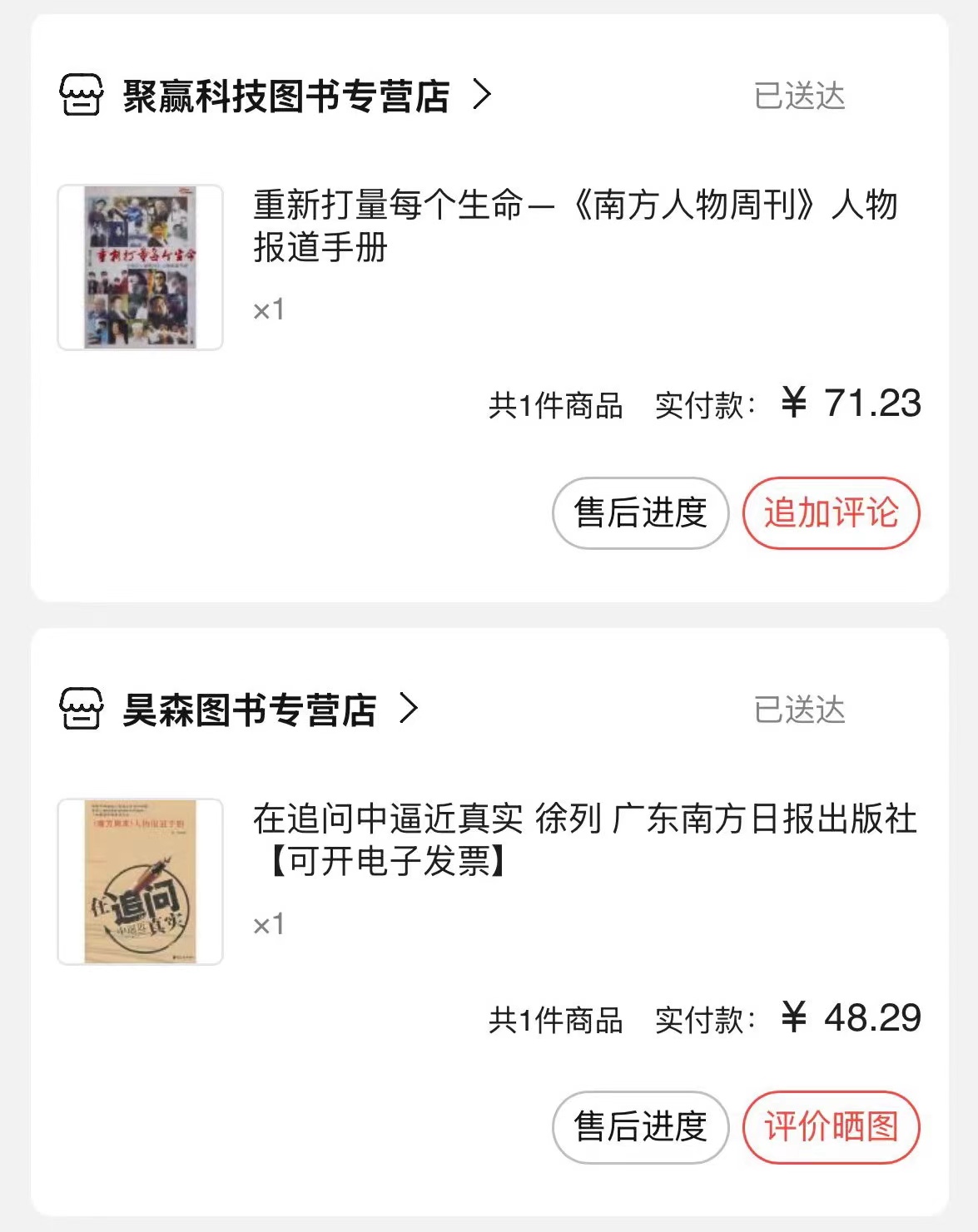 最近,客户段先生向澎湃公众互动平台“服务”(www.tousu.thepaper.cn)反映他通过当当APP在“聚赢科技图书加盟店”和“昊森图书加盟店”两家门店下单购买了两本书,分别花费71.23元(含运费8元)和48.29元(含运费10元),分别购买了《重新审视每一个生命》和《追问中逼近真相》。段先生收到货后,发现两本书都是旧书。段先生申请退款,发现还需要自己承担运费。