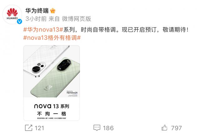 而且实际上,华为在 10 这个月也不会闲着,今天华为终端官方账号发布了关于华为的信息。 nova 13 该系列的预告,同时已开始预订。