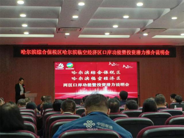 10 月 15 日本,哈尔滨综合保税区和哈尔滨临空经济区(以下简称“两区”)联合在哈尔滨综合保税区举办了“两区”港口功能和两区投资潜力招商推介会。本次交流会旨在向公众展示“两区”的港口功能、优惠政策、区位情况和投资潜力,吸引了众多商会、协会、企业和金融企业代表参加会议,共计 130 余人参加了这次活动。