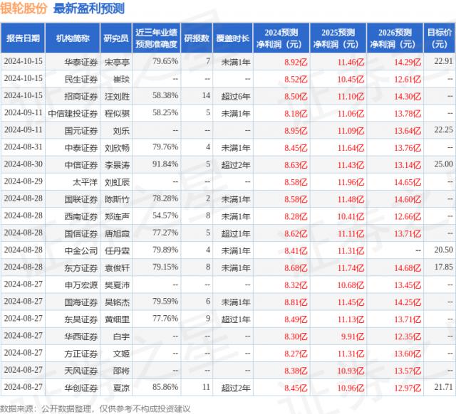 根据近三年发布的研究报告数据,中信证券李景涛研究员团队对该股进行了深入研究,近三年平均预测准确度高达 预测91.84% 2024 年度归属净利润为利润 8.63 十亿,根据现价转换预测。 PE 为 16.82。