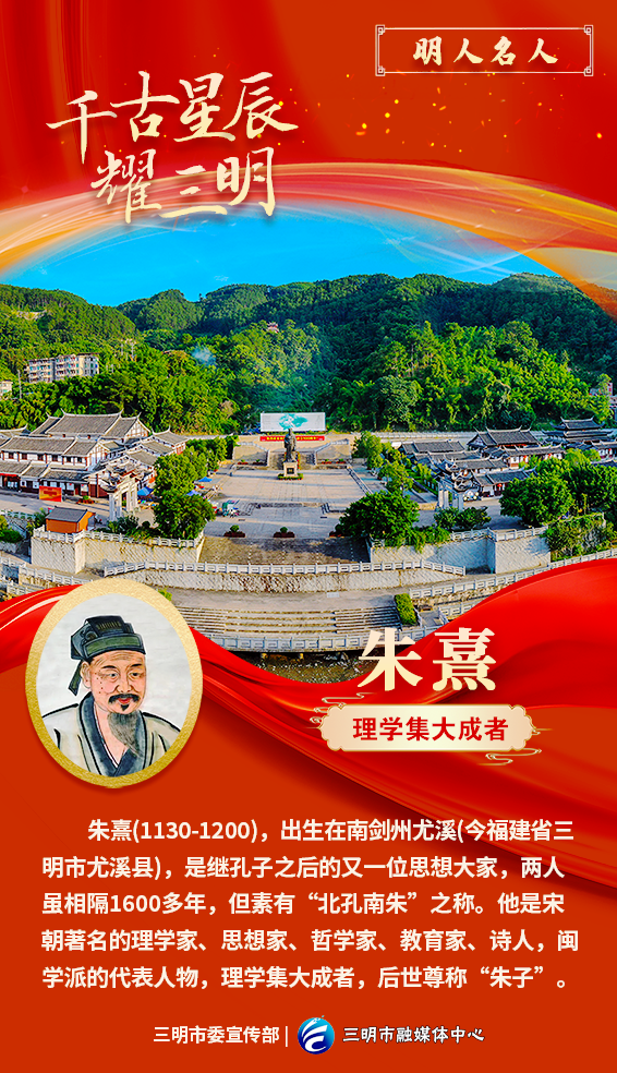 出生于南剑州尤溪(今福建省三明市尤溪县)的朱邈(1130-1200),是继孔子之后的又一位思想家。虽然他们相隔1600多年,但他们被称为“北孔南朱”。他是宋代著名的理学家、思想家、思想家、教育家、诗人,也是闽代流派的代表人物。他是一位伟大的理学家,后人被称为“朱子”。