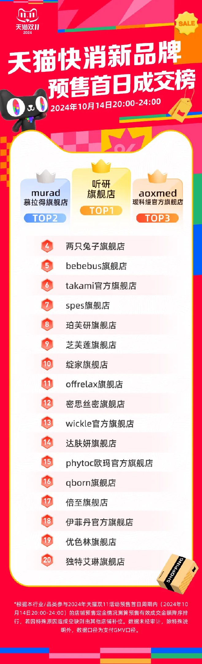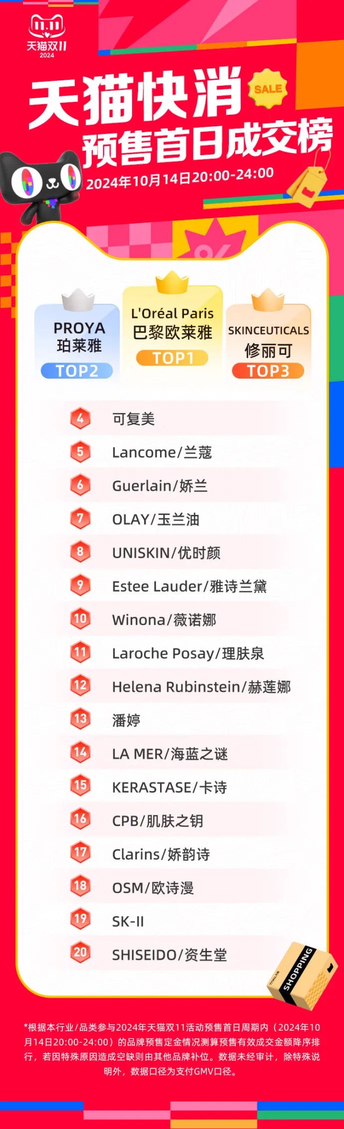 10月14日20日,根据“天猫美妆预购首日交易名单”:00-24:00),前三大品牌分别是珀莱雅、巴黎欧莱雅和修丽可。珀莱雅保持着第一的“宝座”,巴黎欧莱雅紧随其后,修丽可第一次闯入前三。