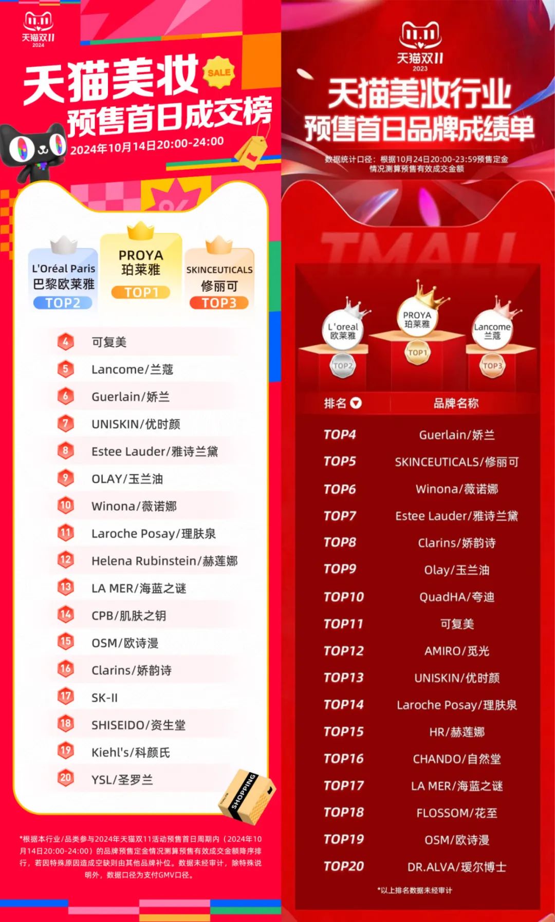 左:2024年天猫双十一预售名单;右:2023年天猫双十一预售名单;