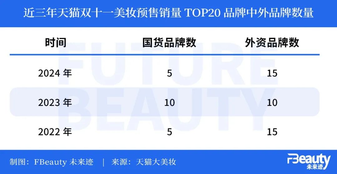但是仔细盘盘,可以发现一些显著的变化,比如“双11天猫美妆预购首日成交榜TOP20”中国产品牌的席位。与2024年相比,2023年从10个下降到5个,而外资品牌则“拉回一个城市”。