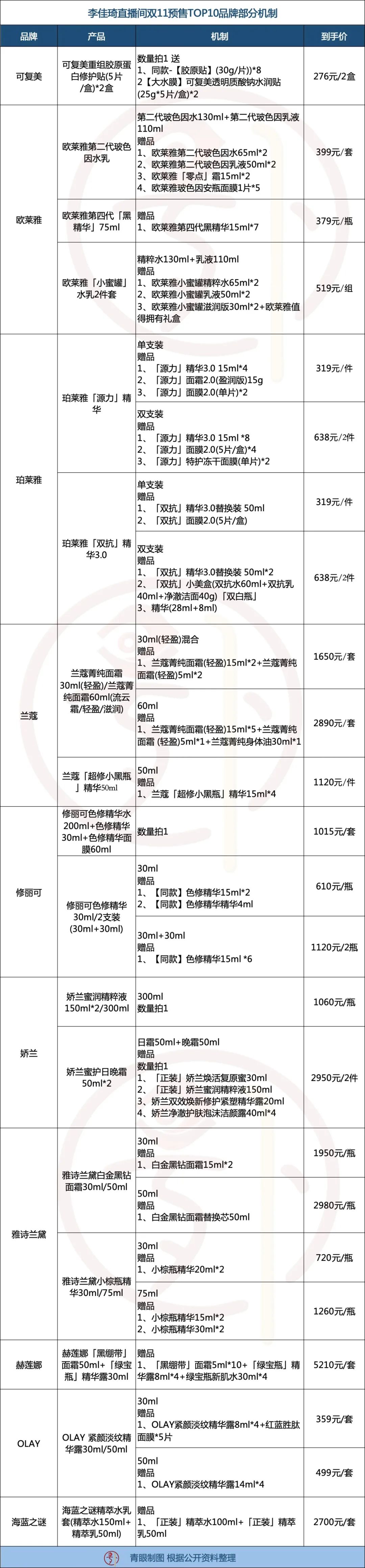 低价仍然是主旋律,“买正送正”已成为常态。。青眼号外注意到,为了满足大促销的需要,在李佳琦的直播间里,有海蓝之谜、科颜氏、娇兰、WHOO、SK-II、雅诗兰黛、倩碧、朵梵等国际品牌,以及自然堂、科德等国产品牌,都推出了“买正送正”的机制。除了青眼,还统计了李佳琦直播间TOP10品牌的一些机制,发现所有品牌都给出了很高的折扣。