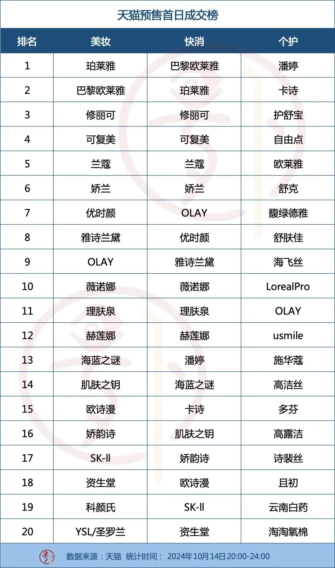 根据天猫官方数据,天猫双11于10月14日晚8:00正式启动。10分钟内,珀莱雅、欧莱雅、修丽可、兰蔻、可复美、娇兰、雅诗兰黛、赫莲娜、玉兰油、海蓝之谜、娇韵诗、皮肤之钥、欧诗漫等13个品牌相继突破1亿元,前30分钟突破20个品牌。