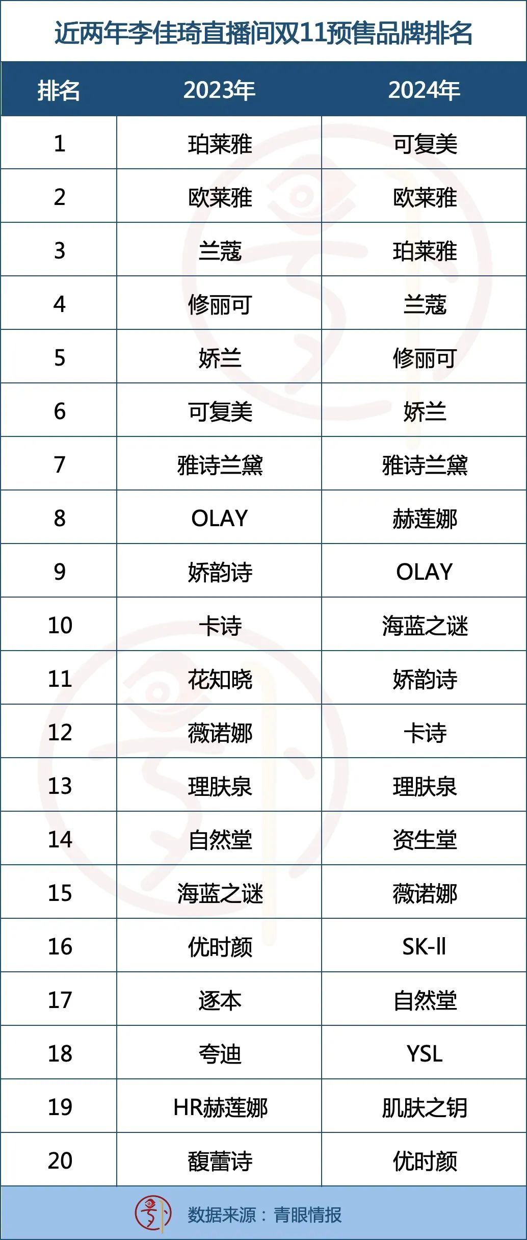 巴黎欧莱雅第一,珀莱雅第二。从天猫双11预购的第一天成绩单来看,珀莱雅继续排名第一,而巴黎欧莱雅排名第二,第三名被修丽占据。兰蔻去年排名第三,这次下降到第五。