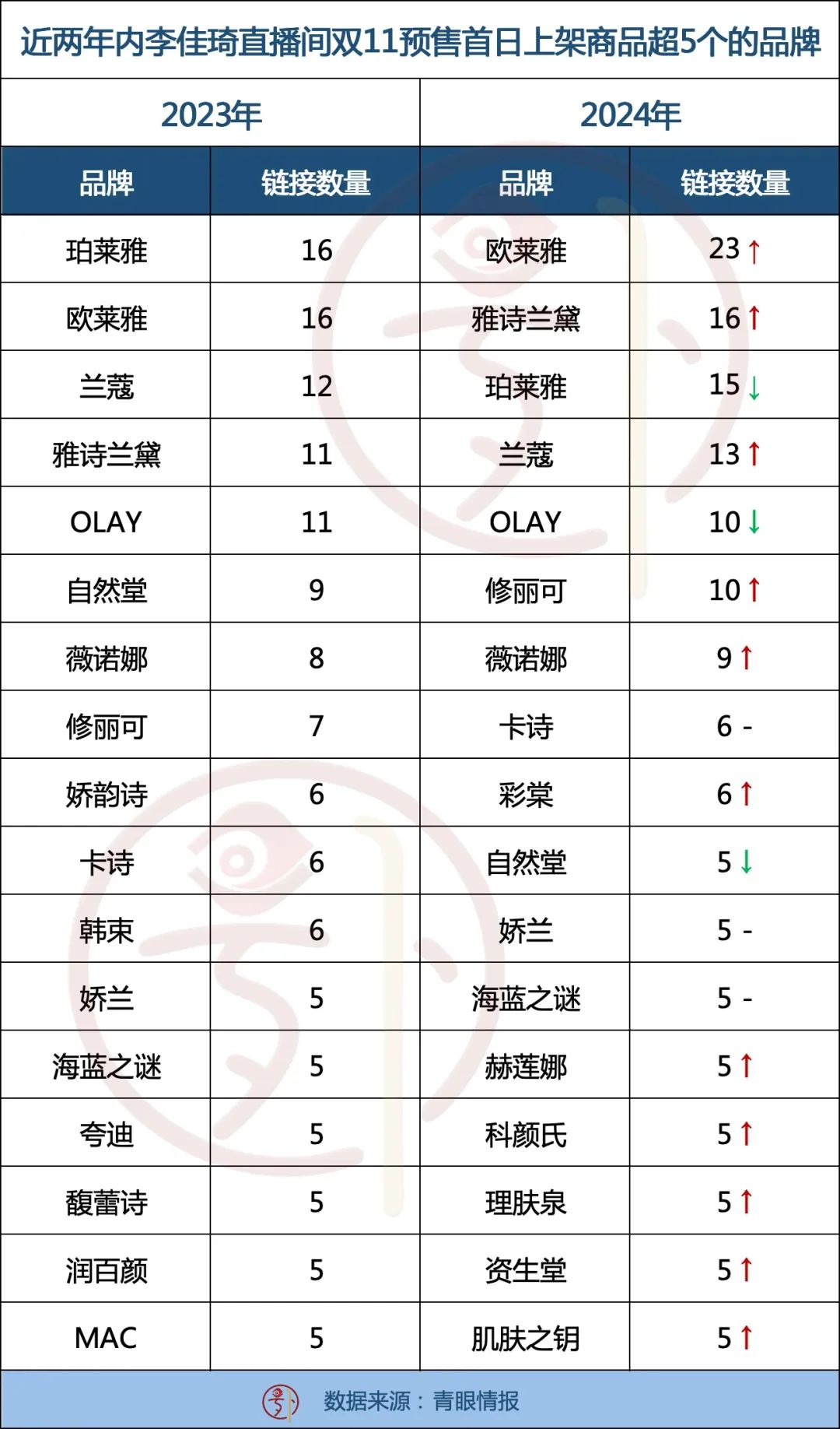 国际品牌纷纷加码,重点关注李佳琦直播间。。据青眼外统计,近两年李佳琦直播间预购链接超过5个品牌,发现很多国际品牌增强了产品链接总数。例如,欧莱雅(包括欧莱雅PRO)的链接数量从去年的16个增加到了23个,雅诗兰黛的链接数量从去年的11个增加到了16个。赫莲娜、科颜氏、理肤泉、资生堂、皮肤钥匙的产品链接也超过了5个。