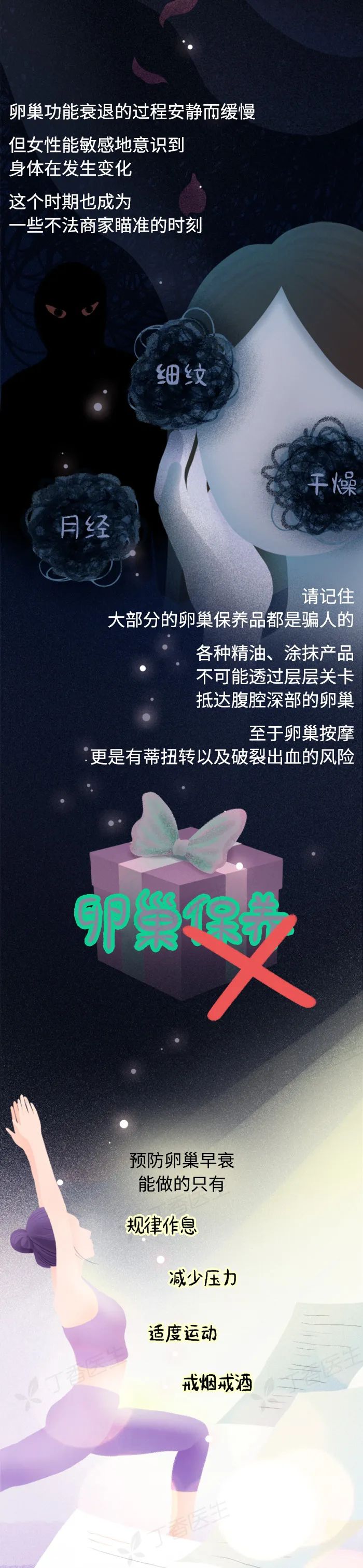 各种流传的「卵巢保养」如果方法不能延缓衰老过程, 40 年前有症状,最好及时就医。早期卵巢功能下降,及时治疗后可以有很好的效果,但如果延迟到卵巢早衰,就很难逆转。
