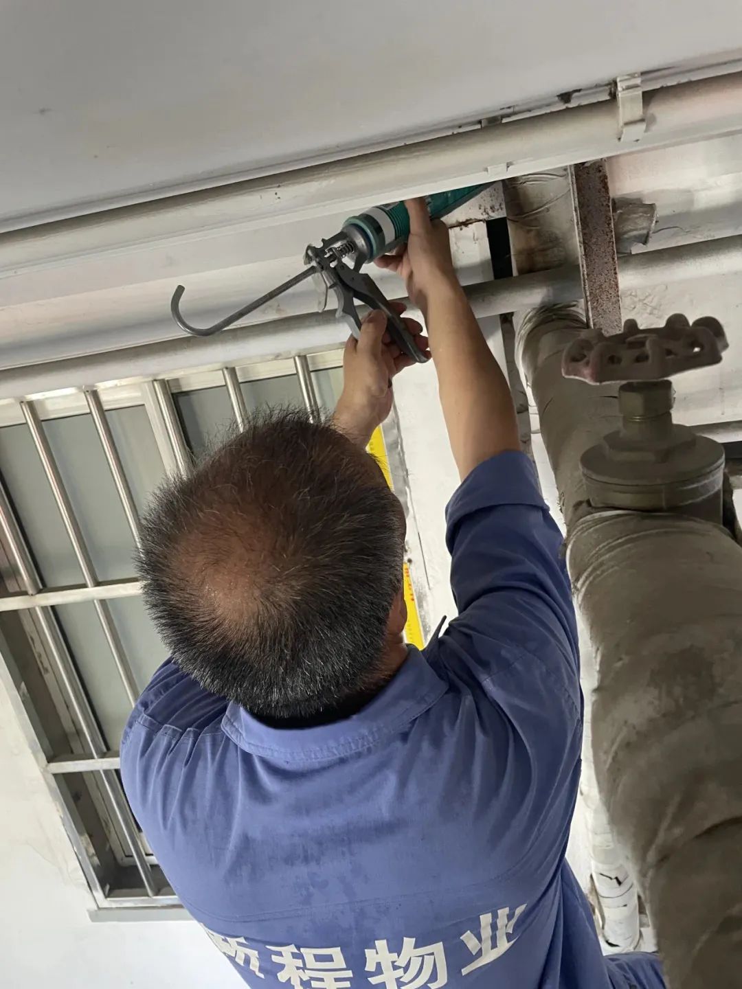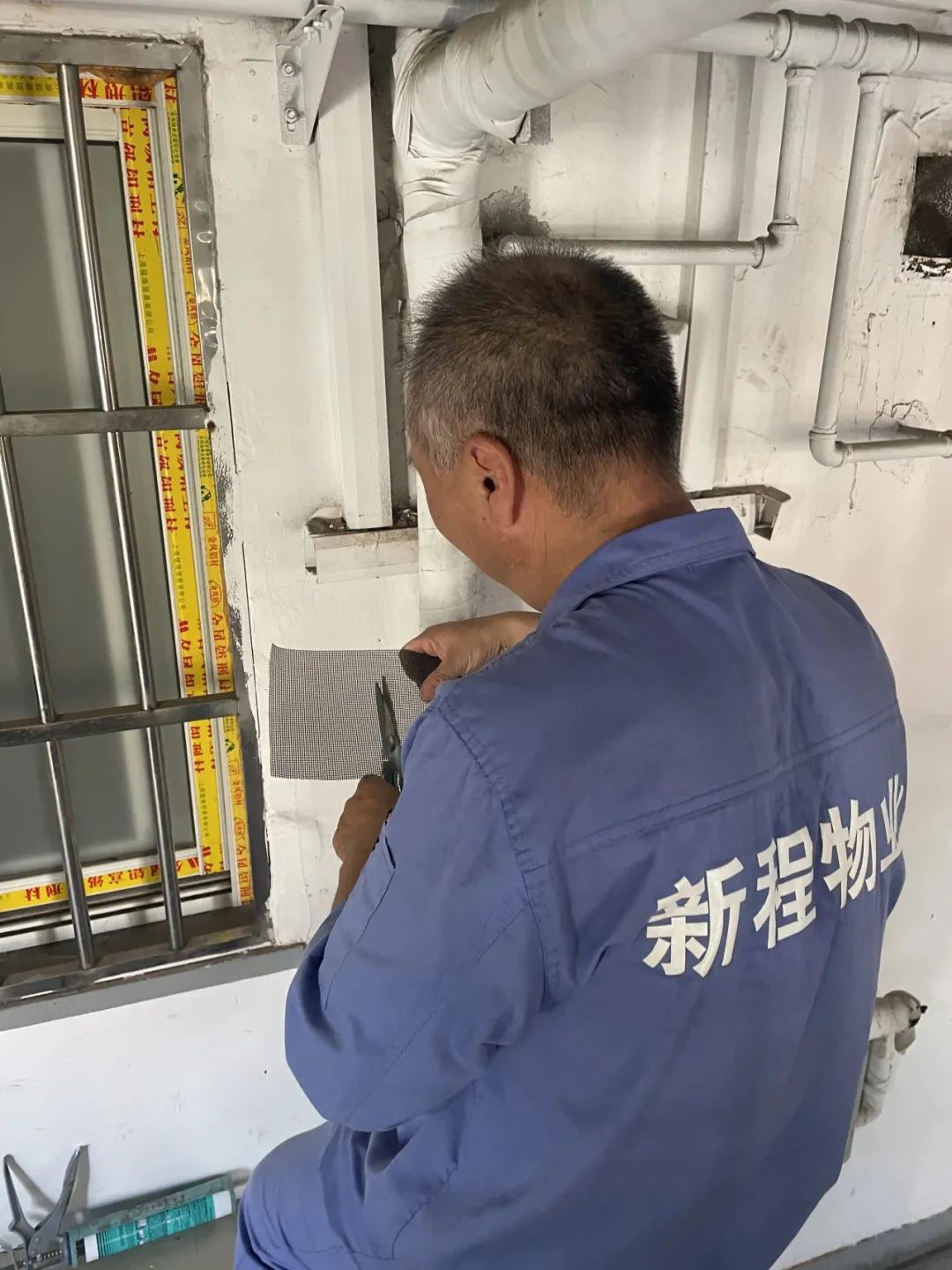 打开工具箱,拿出工具,搭起梯子,修理工把袖子卷起来,对着洞口进行操作。看见他先把洞口边缘清理干净,用不锈钢排风网罩和专业防鼠胶泥堵漏,确保管道和洞口边缘没有缝隙。与此同时,物业人员担心老鼠会从其他通道“潜入”老人家中,再次对其他地下隧道进行全面检查,堵塞的所有漏洞都被堵塞,老鼠经常出没的地方放置了一个捕鼠笼,帮助捕捉老鼠。