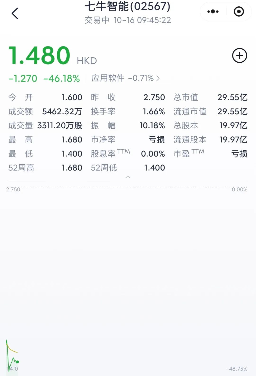 十月十六日,音视频云服务商七牛智能科技有限公司(以下简称七牛智能)正式登陆港交所,发行价为2.75港元/股,但开盘价为1.6港元/股,较发行价下跌42%。截至9:七牛智能股价为1.48港元/股,比发行价下跌46.18%,市值29.55亿港元(约27.09亿元)。