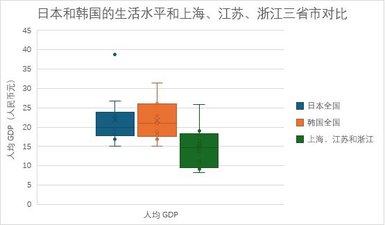 按照今天的汇率计算,我们可以看到,江浙沪一半的人生活质量(按人均GDP计算)已经达到了日本和韩国的最低生活水平,25%的人生活质量与首都东京以外的日本不相上下(其中上海和江苏人口约为50%,浙江人口约为三分之一)。