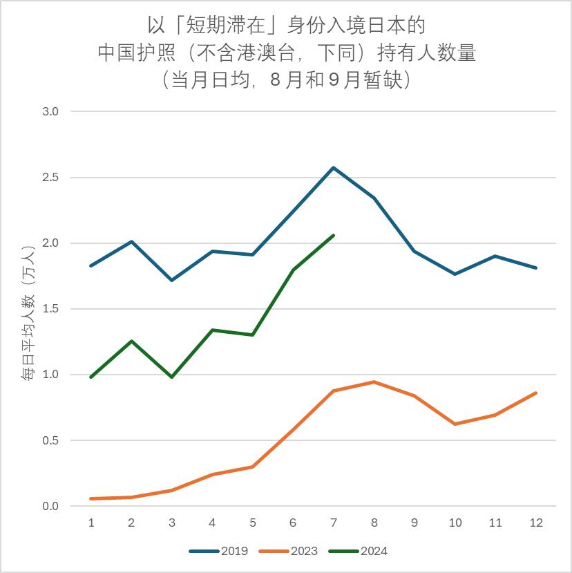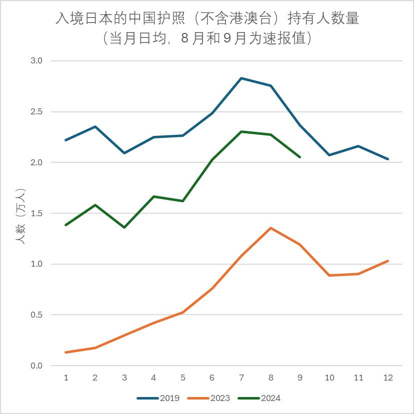 2024年6月,中国护照持有人(不含港澳台,相同)借着暑假的“西风”,突破了2万人的日均水平,连续四个月保持规模。此外,与2019年同期相比,2024年9月恢复到87%。