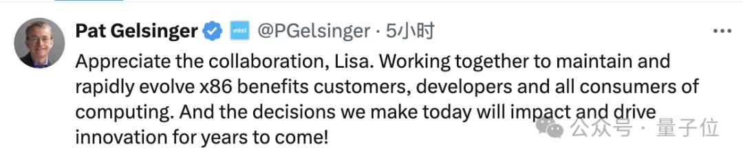 格尔辛格还称赞苏妈,他们的合作对x86的开发者和消费者都有很大的好处。