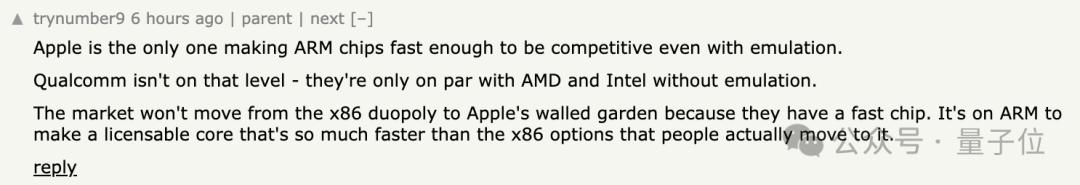 在ARM厂商中,苹果是唯一一家足够快速的芯片,模拟性能也很有竞争力的芯片。然而,市场显然不会从“多头垄断”的x86变成苹果的“墙花园”,因为苹果有更快的芯片。