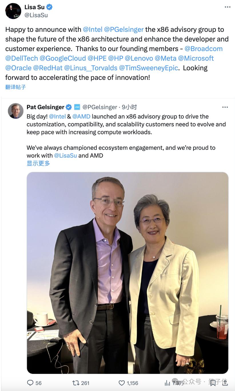 AMD 苏姿丰首席执行官(Lisa Su)还有Intel 格尔辛格首席执行官(Patrick Gelsinger)与此同时,两家公司联合发起了“x86咨询小组”。