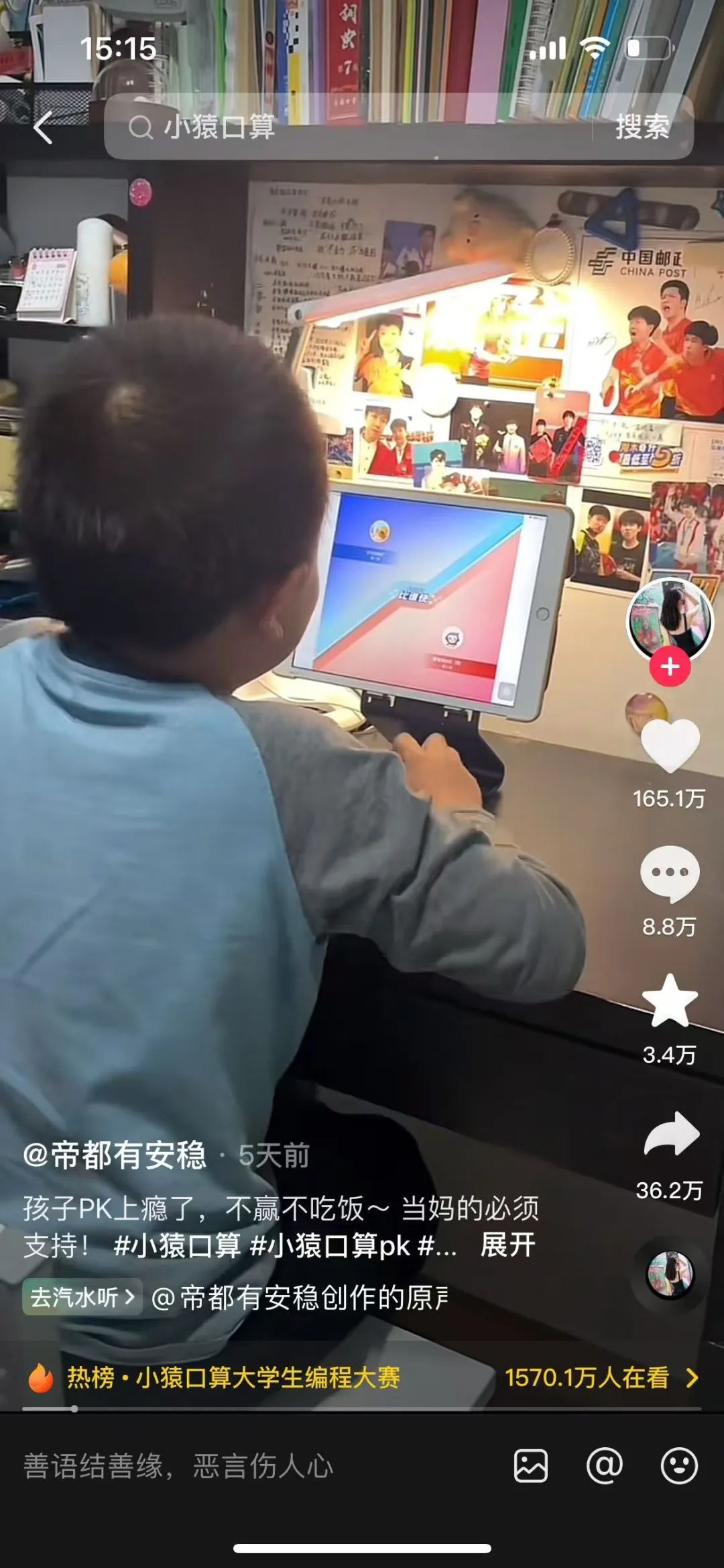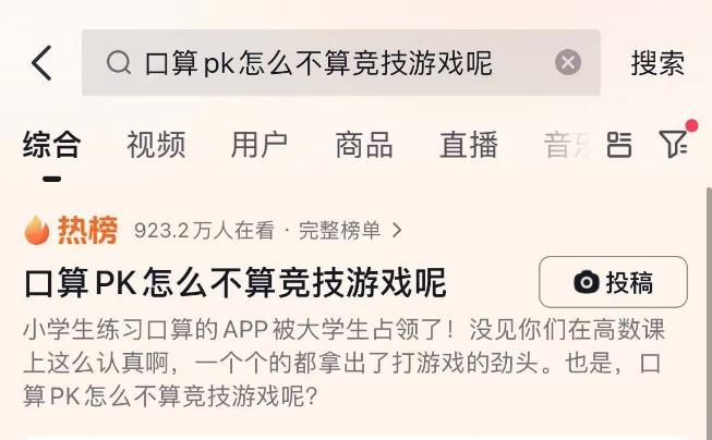 这样一个热门话题确实出现在抖音中,「口算PK怎么不算竞技游戏?」,目前有近一千万人在观看这个话题。