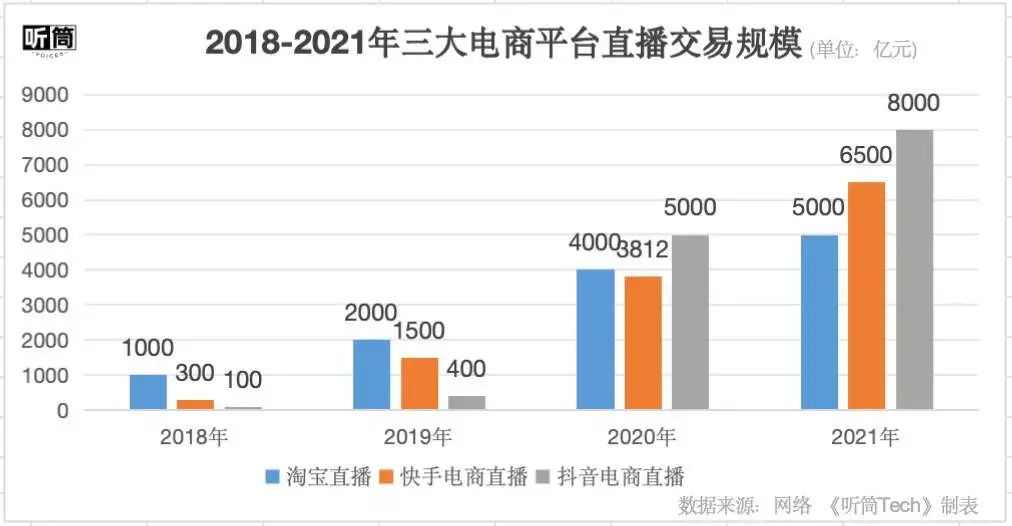 但是随着抖音和快手的猛追,淘宝直播开始缺乏活力。到2020年,抖音GMV首次超越淘宝直播;到2021年,就连快手直播的GMV也把淘宝直播甩在了后面。
