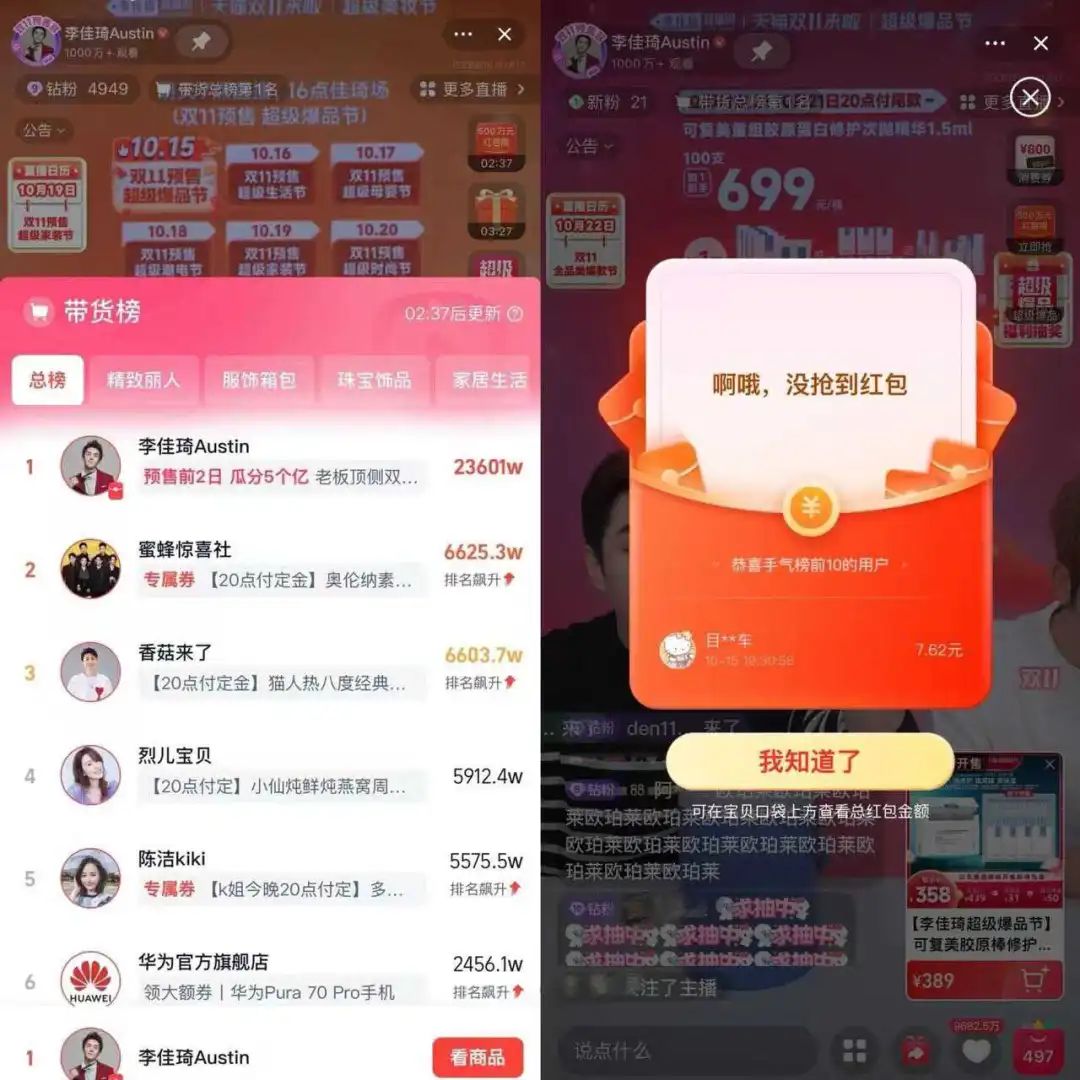 十月十四日,天猫双11开始预售,李佳琦直播间率先破亿。