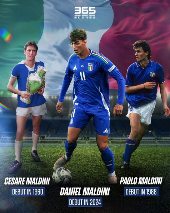到目前为止,继爷爷塞萨雷和他的父亲保罗之后,马尔蒂尼家族的第三代蓝衫国脚在间隔61年1天和22年118天后有了新的续集。