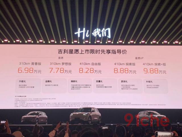 10 月 9 日本,吉利星愿正式上市,共推出。 5 汽车,限时售价为 6.98-9.88 一万元。星愿定位于一辆基于吉利的纯电动小型汽车。 GEA 新型能源结构建设,选用单电机后驱,标配 Flyme Auto 智能化驾驶舱,纯电续航。 310 公里和 410 公里两种,可选装双色车身,单目摄像头及原厂 ETC 等。