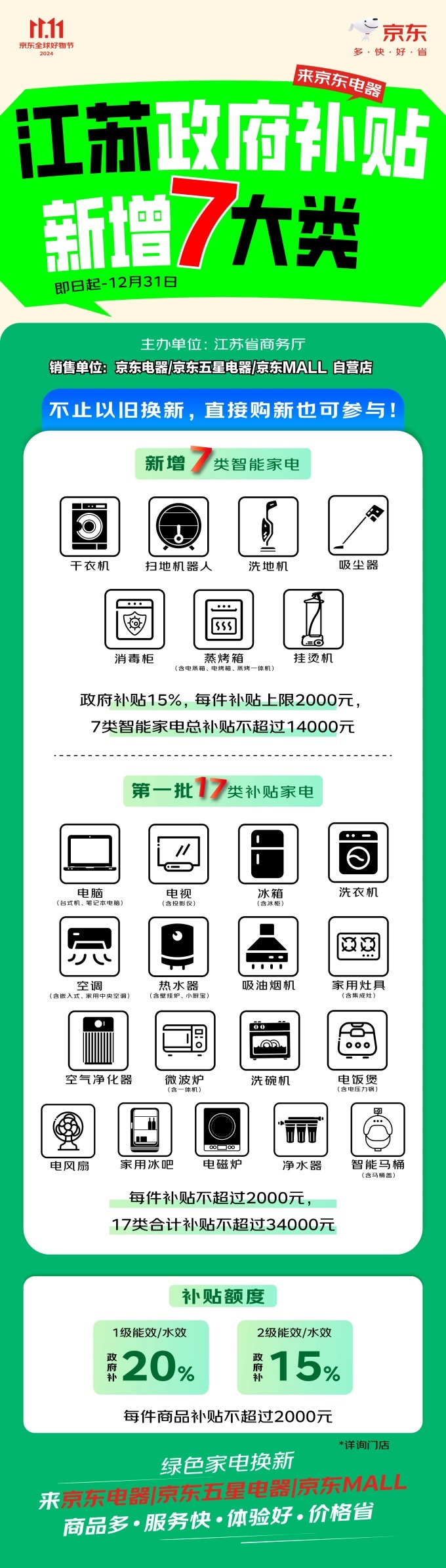 10月16日,江苏省商务厅宣布,自即日起,江苏省新增干衣机、扫地机器人、洗车、吸尘器、消毒柜、蒸烤箱(包括电蒸锅、烤箱、蒸烤机)、挂烫机等7类智能家电提供15%的政府补贴,每件商品补贴上限2000元,7类智能家电总补贴不超过14000元。JD.COM自营店包括JD.COMMALL。、JD.COM电器城市旗舰店和JD.COM五星电器线上线下共有24个品类,超过1.7万款商品被列入“苏新消费”政府补贴商品池,包括中低价位段。JD.COM的自营店已经同时在JD.COM网上开通了“便宜又好”的JD.COM11.11推广,最高折扣可达50%。今年的11.11可能会成为历史上最优惠的推广。