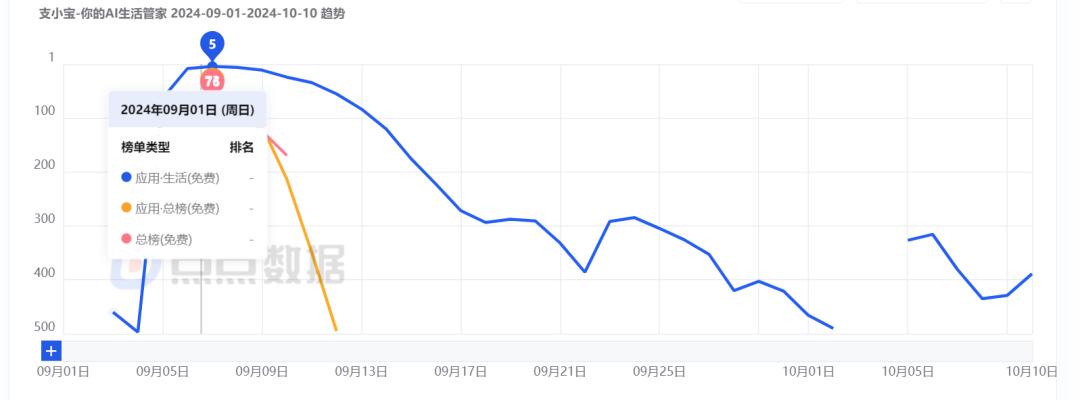 “点点数据”显示,“支小宝”于9月7日发布当天登上App。 Store生活榜第五名,免费榜第76名。从那以后,排名一直在下降。截至10月中旬,已经跌破生活榜400名,榜单完全消失。